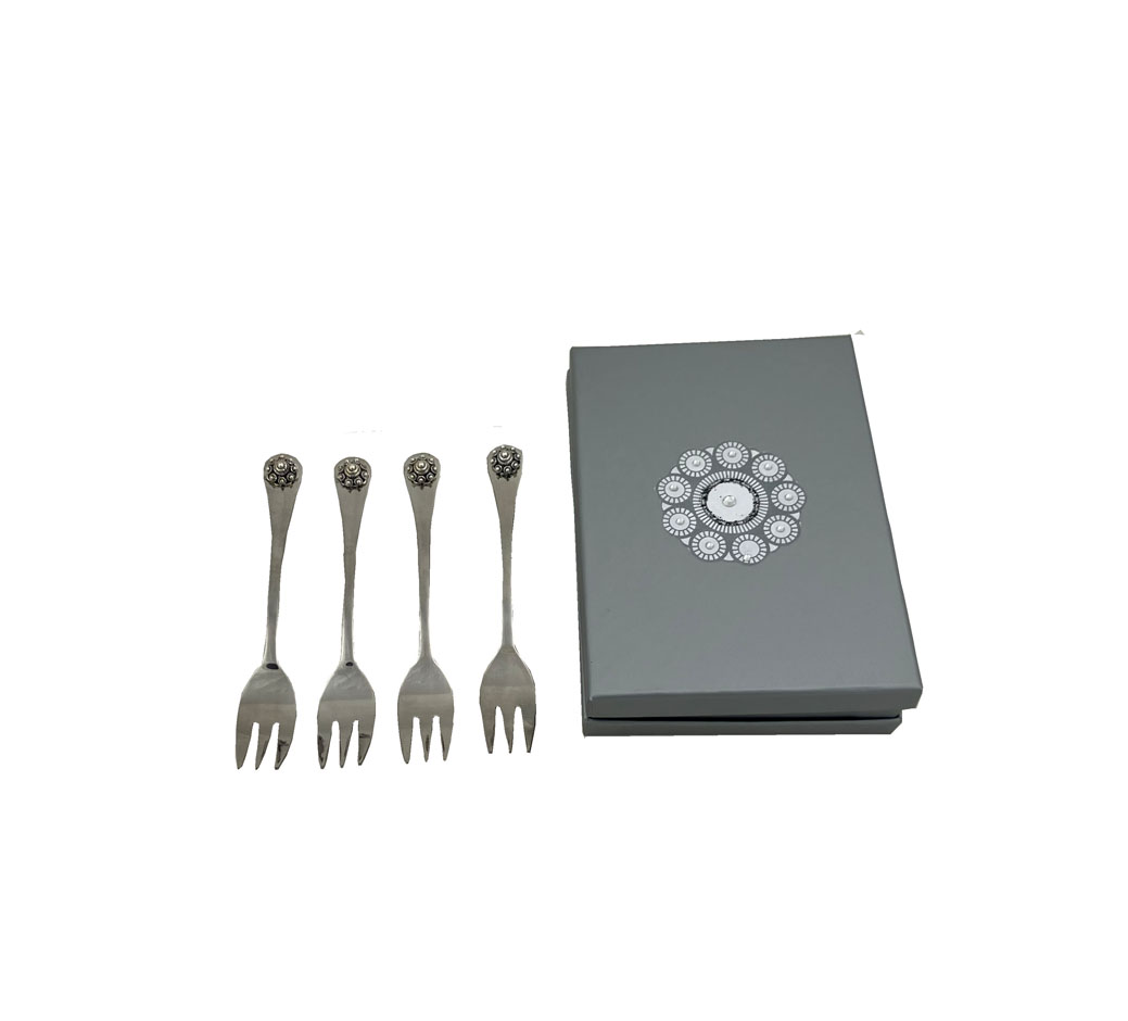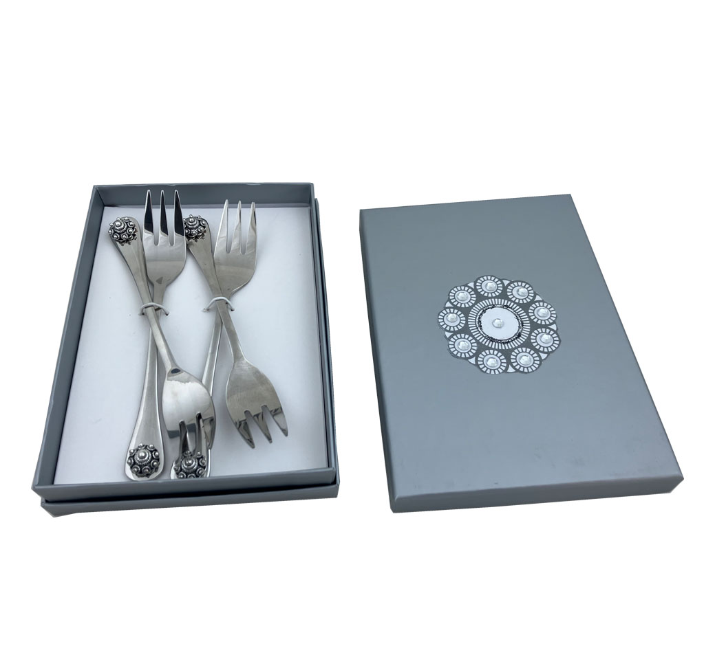 Prachtige set (4 stuks) gebaksvorkjes met Zeeuwse knop in mooi gedecoreerd doosje.
