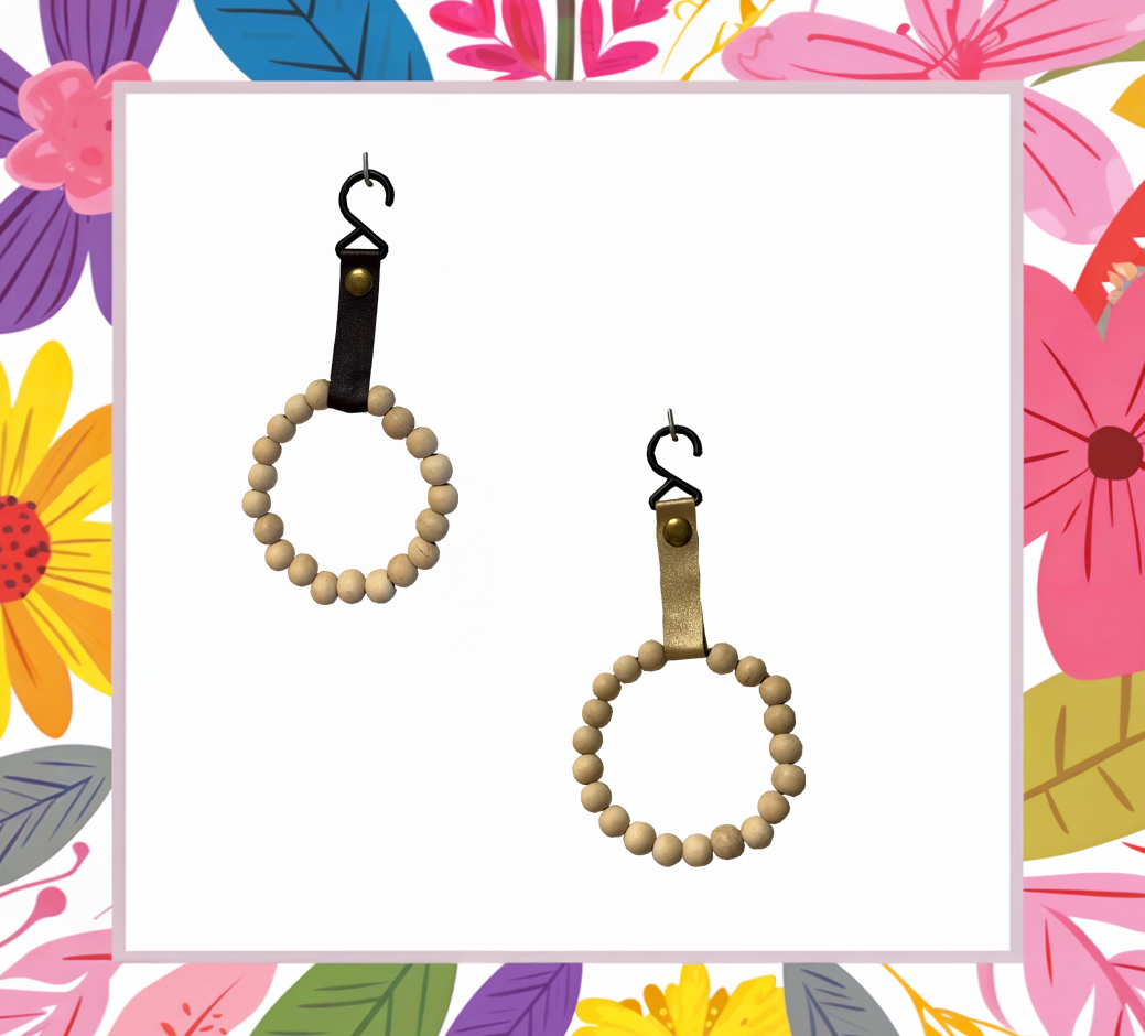 Prachtige handdoekring gemaakt van houten kralen, met leertje om op te hangen.