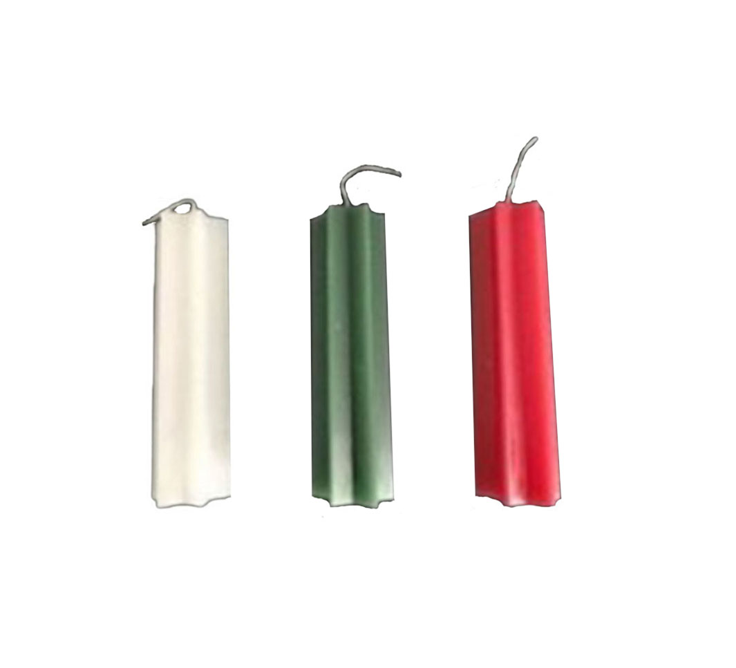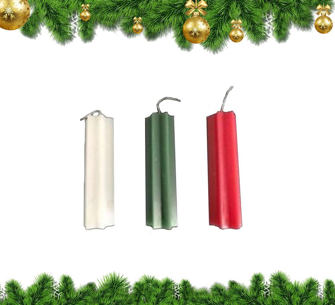 Set bestaande uit 3 lange kaarsen in de vorm van een ster in 3 kleuren: groen, rood en wit.
