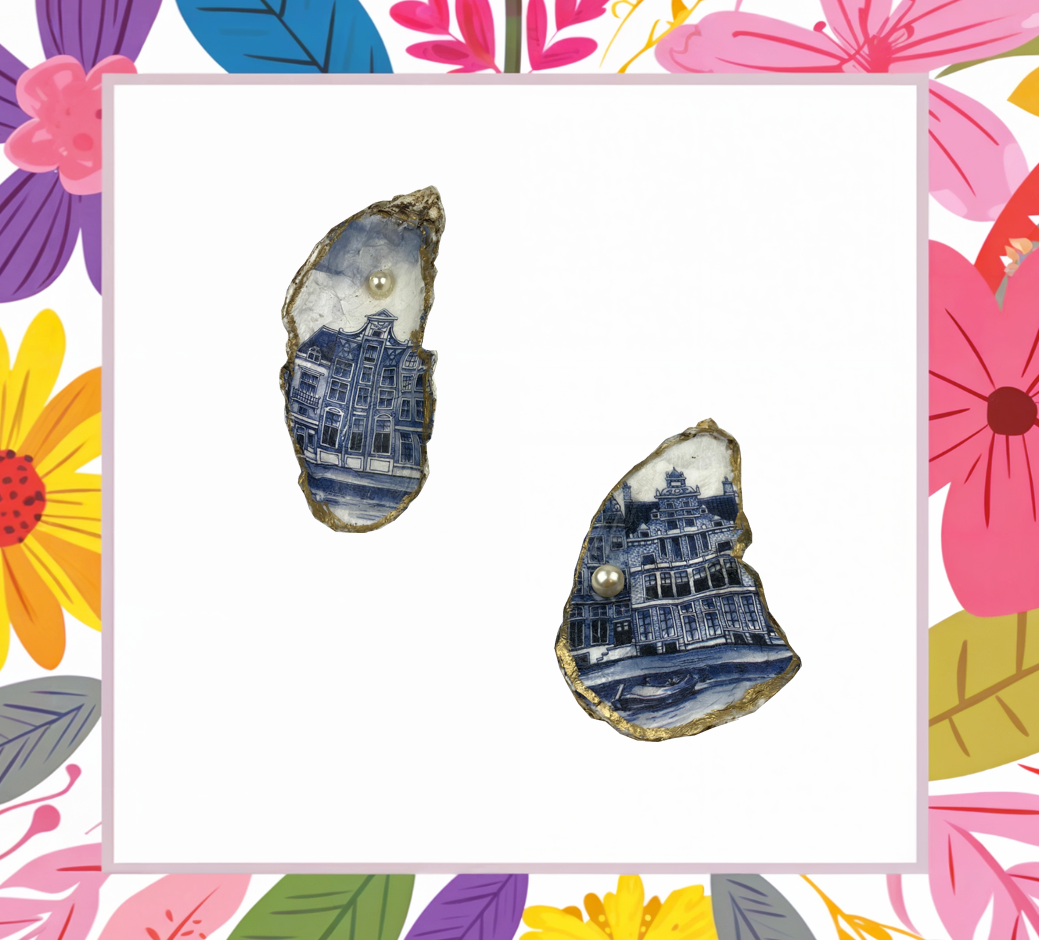 Grote oester gedecoreerd met Delfts blauwe afbeelding en parels.