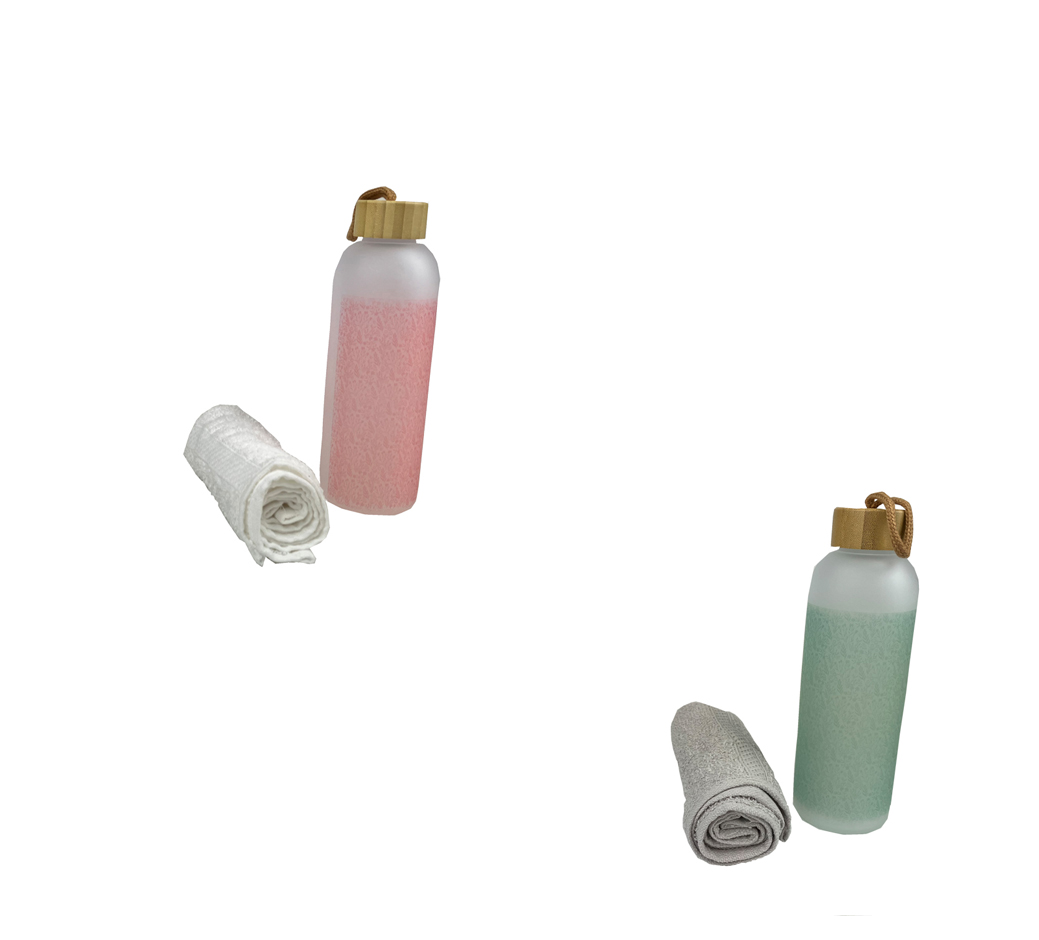 Afmeting fles: ca. 22 cm hoog, Ø 7 cm. Afmeting handdoekje: 30 x 50 cm.