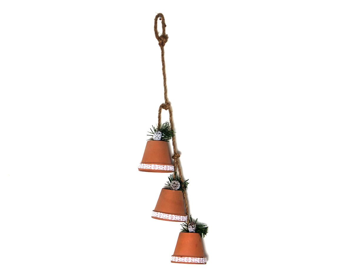 Drie terracottapotjes aan een touw om op te hangen met o.a. dennenappels, heel decoratief!