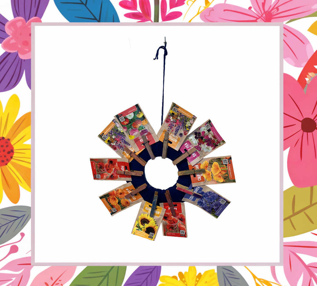 Leuke zaadkrans (met lint om op te hangen) met 10 zakjes bloemen- en groentezaadjes. Krans zelf kan in kleur verschillen.